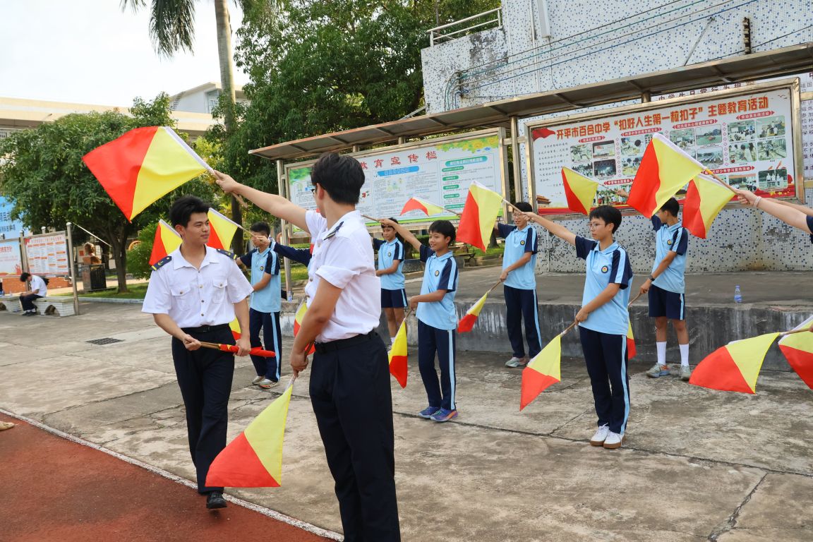 旗语表演队通过整齐划一的动作打出“向海图强”的字母,引得现场阵阵喝彩。中学生们纷纷举起手旗模仿,在“紧急救生信号”“右满舵”等指令中感受航海通讯的独特魅力。