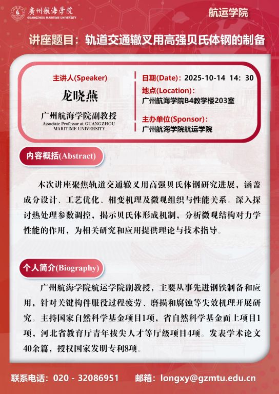 学术讲座预告:龙晓燕《轨道交通辙叉用高强贝氏体钢的制备》