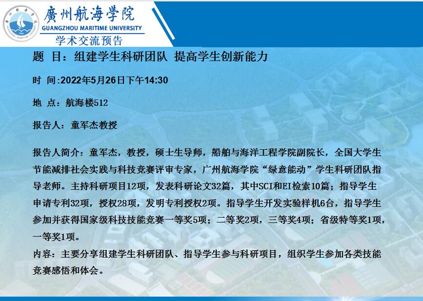 童军杰教授学术交流预告:组建学生科研团队 提高学生创新能力