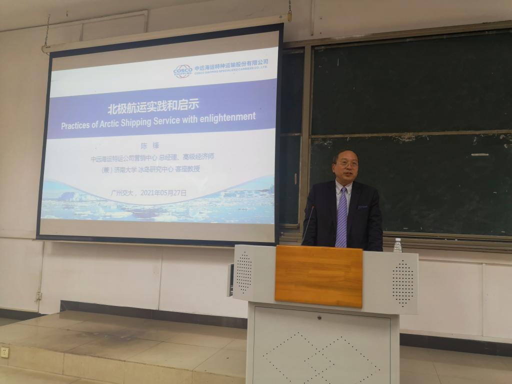 5月27日下午,中远海运特种运输有限公司营销中心陈锋总经理在教学楼110开展了主题为《北极航运实践和启示》的学术交流讲座。