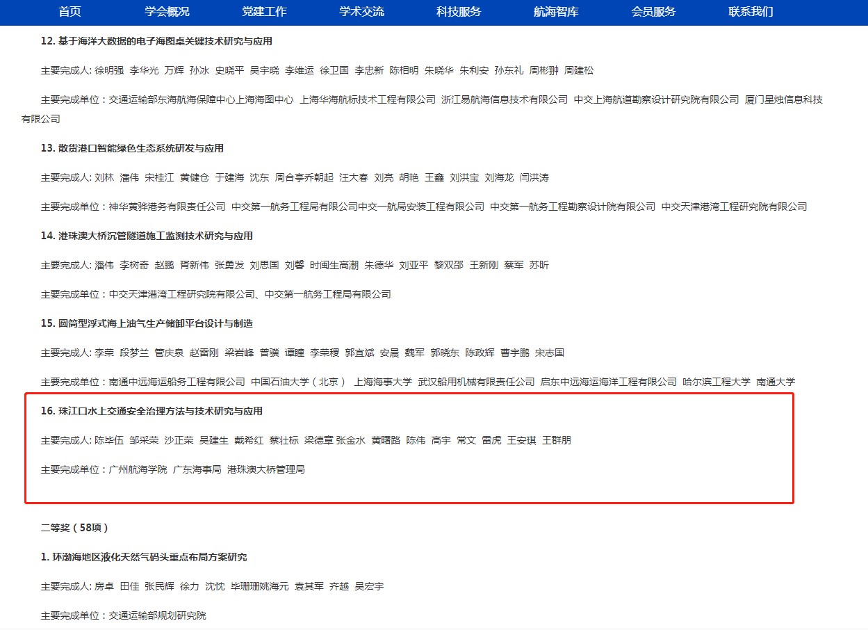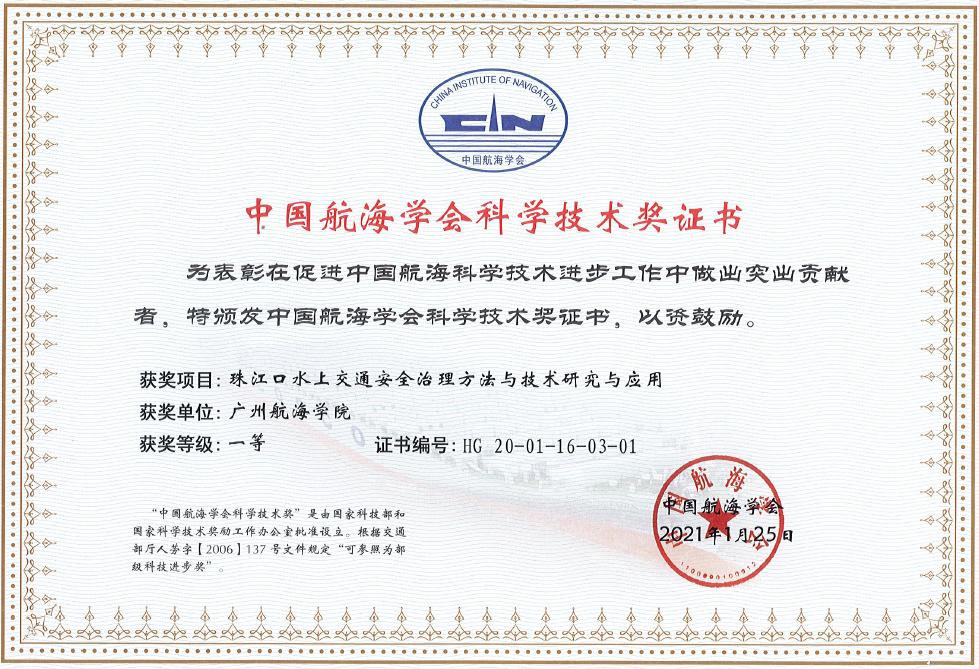 作为第一申报单位,与广东海事局、港珠澳大桥管理局联合申报的项目《珠江口水上交通安全治理方法与技术研究与应用》荣获“中国航海学会科学技术进步一等奖”。