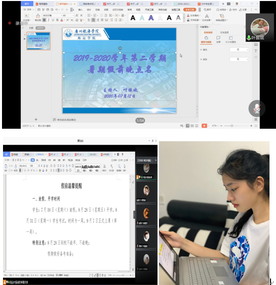 7月12、13日连续2个晚上,赵垒老师通过腾讯会议给海运学院18级、19级海事中队490多名学生召开了3场以“个人事迹分享”、“假期安全教育”为主题的中队会议。会上,海事182冼菁、海事192梁紫坤同学分享了她们的个人生活、学习、工作方面的经历与收获。随后,赵垒老师从疫情防控、政治安全、网络安全、交通安全、消防安全、饮食安全、居家安全、兼职实习安全、大学生计划生育问题、校园贷问题、防诈骗、防溺水、防传销等方面进行教育,多方位为同学们分析了以往发生的案例及经验教训。同时,赵老师就下学期返校通知、考试复习、英语四六级备考、生源地贷款、困难生认定、医保报销等问题,再一次提醒同学们做好准备。最后,赵老师就大学生为什么要培养社会责任感,如何培养责任感与大家进行了深入交流,并以中国航海日到来为契机,勉励同学们坚定理想信念,积极投身海洋强国建设。