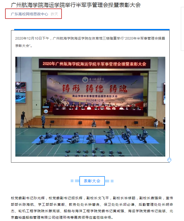 近日,广东高校网络思政中心、全国易班网今日头条转载我校海运学院半军事管理会操暨表彰大会。