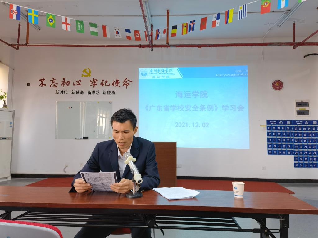 (海运学院供稿)2021年12月2日下午,海运学院全体教职工在航海楼512会议室召开了主题学习会,全体教师认真学习了《广东省学校安全条例》,内容主要涉及校园安全管理、校外实习安全管理、安全教育与培训等多个方面,学习会由海运学院党委副书记林少栋老师主持。