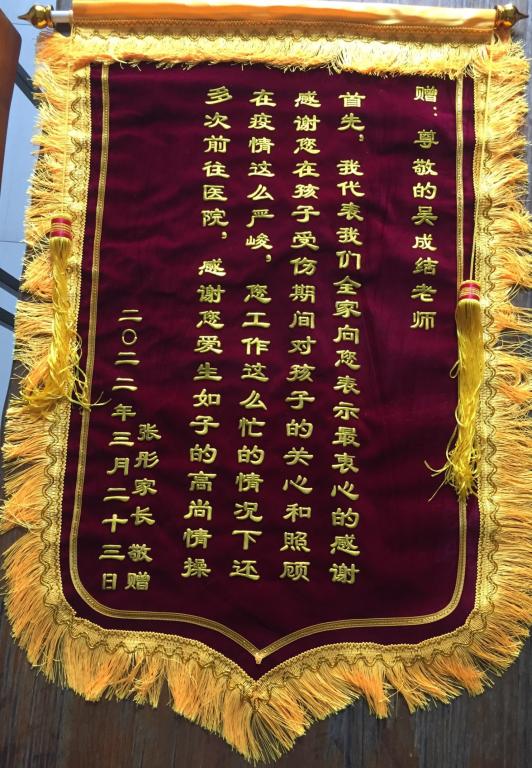 3月18日下午,我院航海213班张彤同学在上体育课期间韧带受伤,到广医五院检查后需要马上做韧带手术,中队长吴成结老师马上前往医院协调其住院事宜,跟该生家长沟通检查、手术等情况,并多次前往医院照顾学生,帮助该生手术后康复治疗、沟通医保报销等。该生家长表示,因为家远在黑龙江疫情管控区,无法到医院照顾,在特别无助的时候,是吴老师给了张彤及我们家长帮助和安慰,无法用言语表达对吴老师的谢意,衷心感谢吴老师和同学们对他的帮助和照顾。锦旗每一行文字都饱含着家长的真挚情感和蕴藏着老师爱的情怀,更是家长对吴成结老师的褒奖。真爱如雨,润物无声,多年来,吴成结老师认真做好学生工作,以学生为中心,细心关爱每个学生的身心健康,深受学生好评。