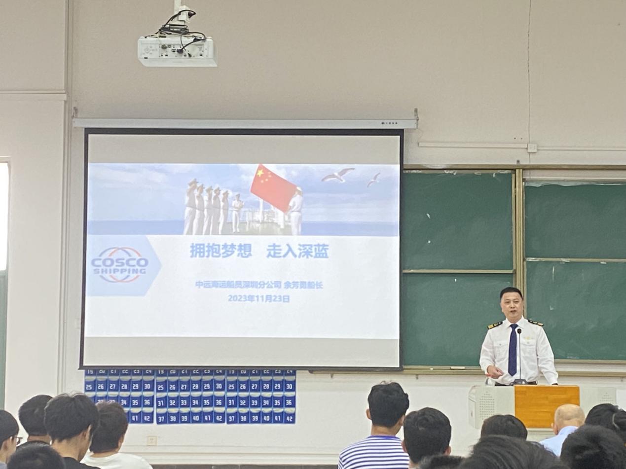 (海运学院、轮机工程学院供稿)11月23日下午,中远海运船员管理有限公司深圳分公司余芳勇船长应邀来校在教学楼111室作了一场题为“拥抱梦想,走入深蓝”的讲座。中远海运船员管理有限公司深圳分公司副总经理、轮机长颜权,资源开发部经理、船长钟丁牙,船员管理库副经理、轮机长吴清意应邀一同来校与师生交流座谈。海运学院中队长李良、轮机工程学院中队长赵垒和250余名航海类专业学生到场聆听讲座,讲座由海运学院党委副书记林少栋老师主持。