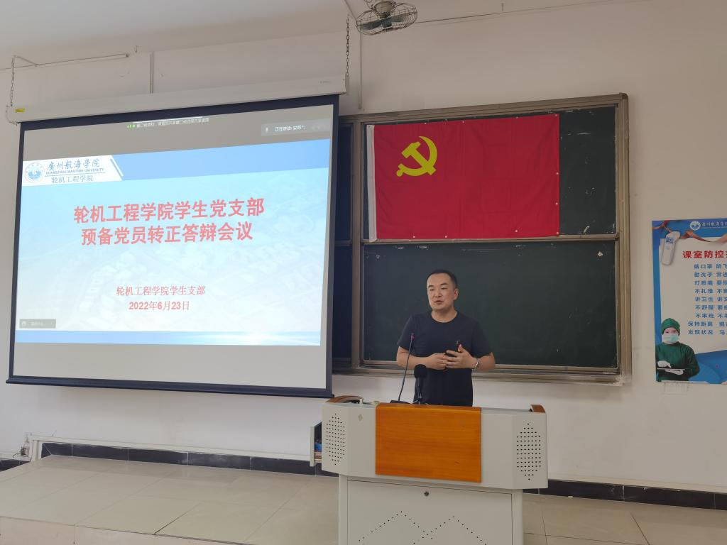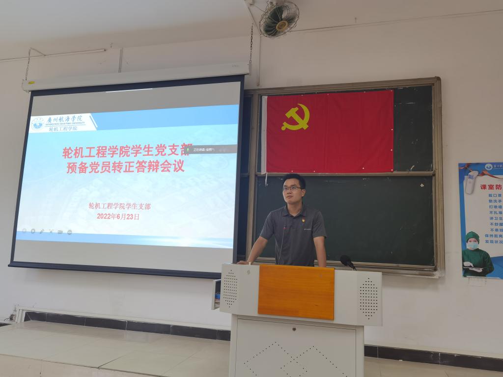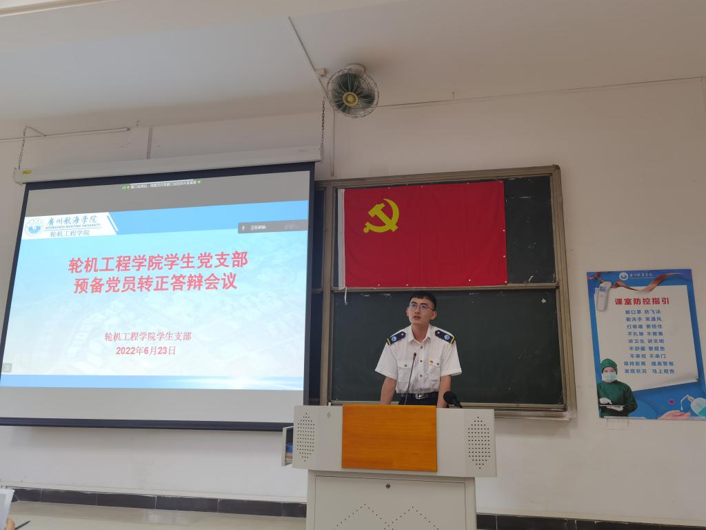委员会发展党员工作办法》中“三投票五公示一答辩”制度,轮机工程学院学生党支部于6月23下午在教学楼207举行了预备党员转正答辩会。学院学生第一党支部书记郭世俊老师、学生第二党支部书记赵垒老师、中队长杨璟老师参加此次答辩会并担任评委。