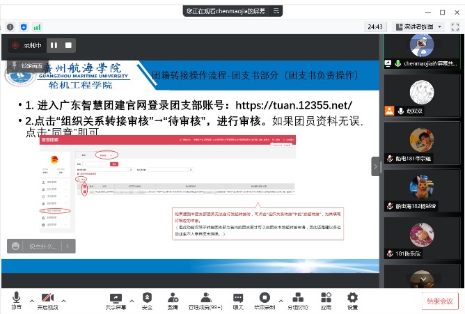 会上,陈茂嘉首先结合《广州市共青团基层团务工作指南》强调了团员组织关系转接中团员的职责以及毕业生团组织关系转接的必要性和重要性。接着,从团员和团支书两个角度详细讲解了团组织关系转接中的具体操作和注意事项。同时,结合流程图,讲解了不同毕业去向转接的不同方向,以免团组织关系转出时发生信息错误导致不能顺利完成转接。会议最后,陈老师针对同学们团组织关系转接过程中容易出现的问题进行答疑。