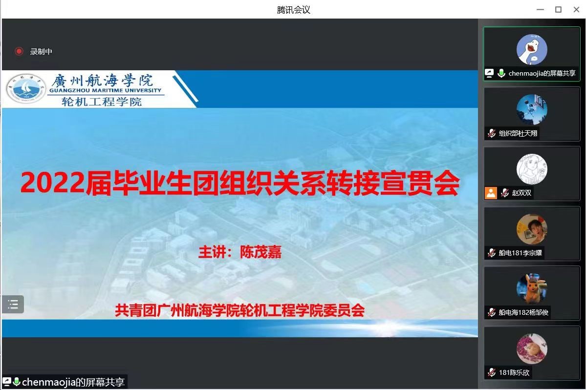 (轮机工程学院供稿)为贯彻落实校团委关于毕业生团组织关系转接工作的相关要求,做好今年共青团学社衔接工作,5月30日晚,轮机工程学院分团委通过腾讯会议召开了2022届毕业生团组织关系转接宣贯会。会议由2018级中队长赵双双老师主持,学院团委书记陈茂嘉老师主讲,全体2018级毕业生团员参加了本次会议。
