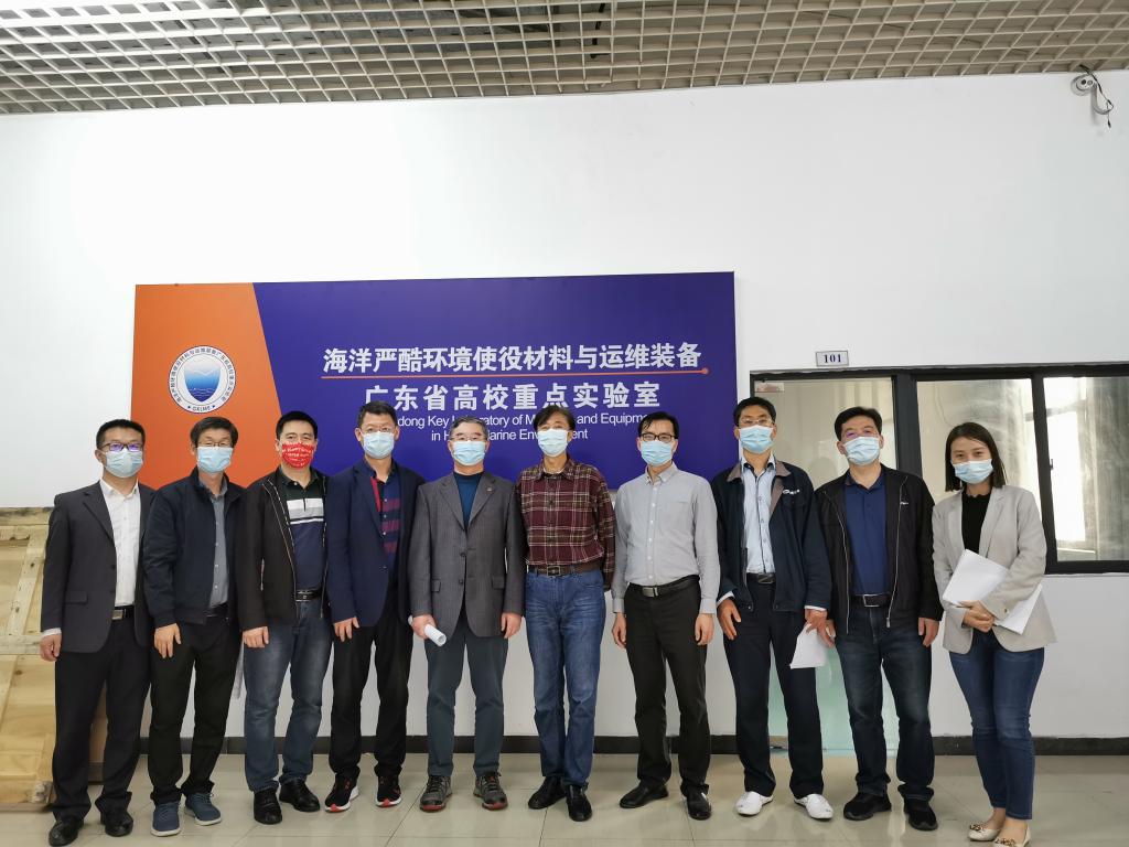 本次验收工作专家组成员有:中山大学陈建教授,广东腐蚀科学与技术创新研究院杜昊研究员,广东工业大学曹晓国教授,中船黄埔文冲船舶有限公司闫德俊教授级高工;及我校代表:资产与装备处陈建平处长,轮机工程学院滕宪斌院长,《海洋严酷环境使役材料与运维装备》广东省高校重点实验室主任尹衍升教授、李建新教授,科研处曹辉教授,资产与装备处资产管理科刘勇科长和甘恬静老师等。