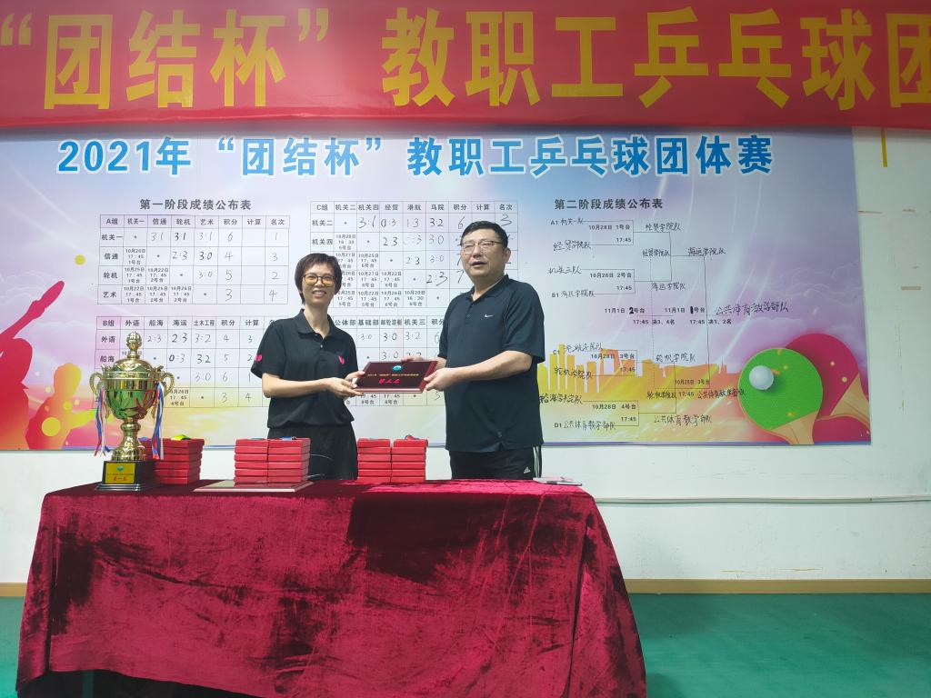 “团结杯”教职工乒乓球团体赛在体育馆2楼举行,经过初赛和决赛两个阶段的角逐,在轮机党委支持下,我院教职工乒乓球队在领队滕宪斌院长和教练容柏青书记的带领下,合理布阵,由陈茂嘉和郝轶卓老师组成混双,叶文林老师男单,游雪清老师女单,张晖和张春彦老师组成男双,张怡和宋艳琼老师组成女双,在第一阶段初赛中战胜多支传统强队小组出线,在第二阶段决赛中,面对实力更加强大的对手敢打敢拼顽强比赛,多次挽救赛点成功打入四强,在三四名争夺中靠着团队出色冷静地发挥最终荣获赛事第三名,达到了轮机工程学院成立以来该项赛事最佳成绩,p站视频