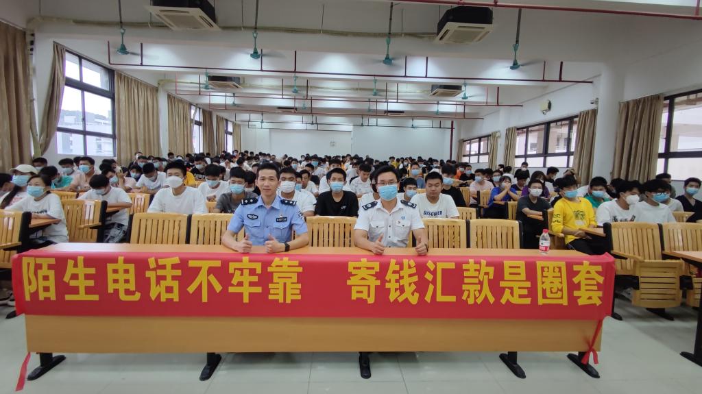 警务工作站吴清达警长,在健兵北400教室为轮机工程学院2021级全体新生开展防范电信网络诈骗宣讲会,学院党委容柏青书记,新生中队长郭世俊,2021级全体新生参加了教育活动。
