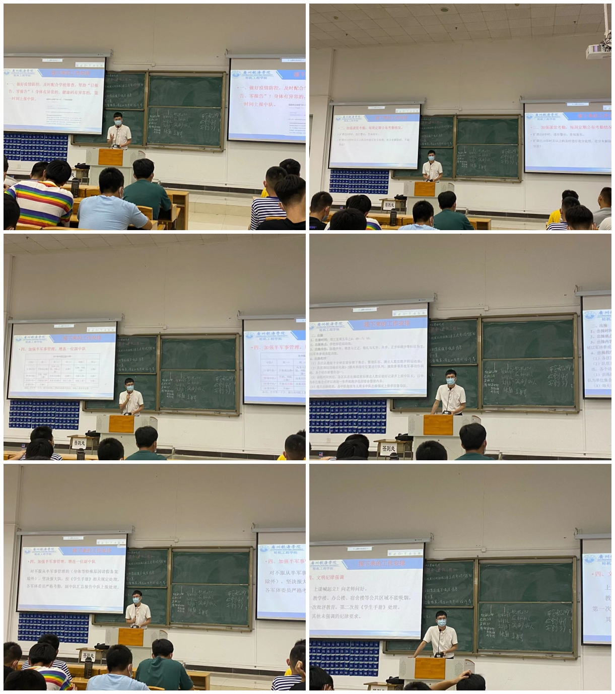 会议第二项对接下的中队工作进行布置:一是做好疫情防控,及时配合学校排查,坚持“日报告、零报告”,非必要不离校,离校要报备。身体有异常的、健康码有异常的同学,第一时间上报中队长;二是及时更新通讯信息,便于中队精准开展工作;三是加强课堂考勤,每周将定期公布考勤情况,旷课达6学时进行警示教育、通报家长,旷课达10学时及以上的严格按《学生手册》进行处分处理;四是加强半军事管理,严格按照学院半军事管理计划执行到位;五是要注重文明礼仪,公共场所不能吸烟等。