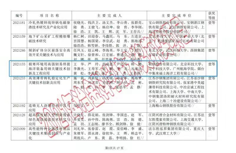 冶金科学科学技术奖(原冶金部技术奖)是中国冶金行业最高科学技术奖励,单项授奖人数和授奖单位数实行限额;特等奖奖人数不超过27人,单位不超过15个;一等奖的人数不超过15人,单位不超过10个;二等奖的人数不超过10人,单位不超过7个;三等奖的人数不超过5人,单位不超过5个。其中,在科学上取得突破性进展,学术上为国际先进水平,并为学术界所公认和广泛引用,推动了本学科或相关学科的发展,或对经济建设、社会发展有重大影响的项目可评为一等奖。2021年度冶金科学技术奖共评定奖项115项,其中特等奖4项、一等奖26项。我校与鞍钢国家重点实验室等4家单位合作申报的《极寒环境用高强韧易焊接海洋装备用钢关键技术创新及工程应用》项目获得2021年度冶金科学技术奖一等奖。该奖是我校海洋材料平台建设过程中继深海与南海方向获得两项国家自然科学基金项目资助之后,首次在极地极寒材料研究领域获得科技奖励,该成果在极地材料研发领域的突破,不仅为国家极地船舶材料的国产化奠定规模化生产基础,也极大地提升了我校参与和主持国家“卡脖子”工程研究的能力并扩大了学校在海洋工程领域的学术影响;对我校交通大学学科建设及加速我校科研队伍牵头申报省部级以上奖励均具有积极的推动作用。