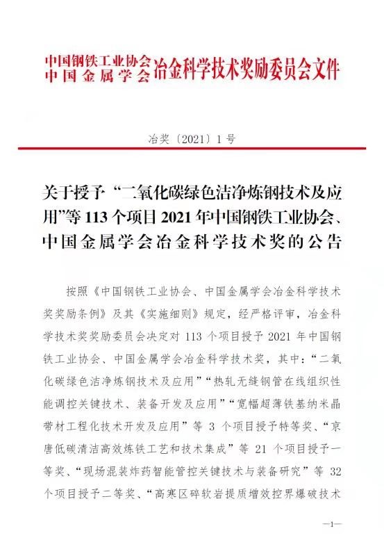 附注:冶金科学技术奖是行业最高奖项,一等奖以上项目可以作为第二年度参选申报国家科学技术奖的初评。是经国家科学技术部批准、由社会力量设立、面向全国评选的经常性科学技术奖;与中国汽车工业科学技术进步奖、何梁何利基金科学与技术奖、光华工程科技奖、中华医学科技奖等奖励并列为在统计时归入省部级奖励范畴的社会奖励。