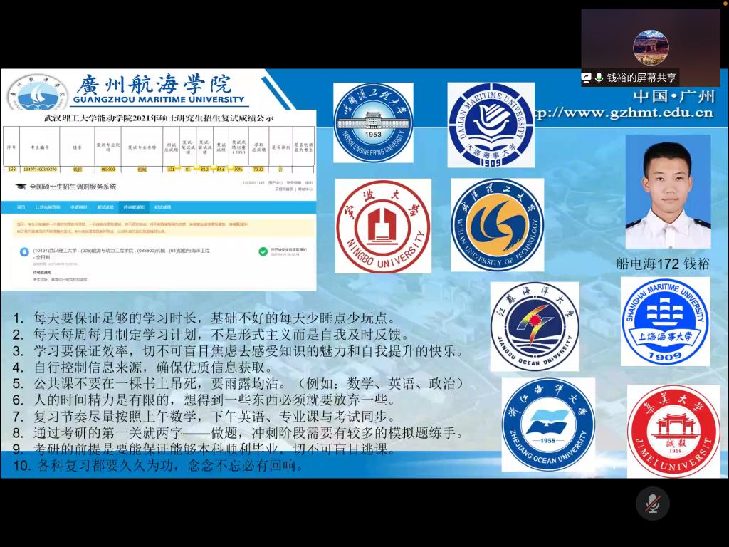 会议伊始,主持人介绍本次活动目的和4位考研党员同志的基本情况。接着,轮机172陈昊、船电陆171严小珊、轮机174戚圣琛、船电海172钱裕四位党员同志依次分享自己的考研经验,从紧锣密鼓的学习日程安排、星罗棋布的各科网站资料收集、考前心态调整、学校专业选择及考场周围租房环境安排等,师兄师姐毫无保留分享了考研的经验教训。随后,同学们热情反馈,积极询问师兄师姐有关学校选择、作息安排等具体问题,线上交流氛围浓厚。