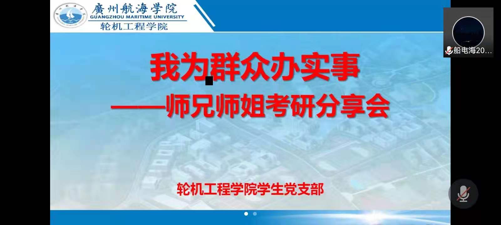(轮机工程学院供稿)为调动学生考研积极性,帮助更多的轮机学子圆考研梦,根据学院党委“我为群众办实事”的工作部署,轮机工程学院学生党支部于6月29日晚利用腾讯会议召开“师兄师姐考研分享会”。学生第一、第二党支部书记郭世俊、赵垒老师,2017级考研成功的师兄师姐及学生代表参加了此次会议。