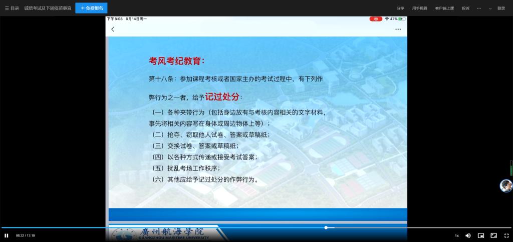 (轮机工程学院供稿)为加强学风建设,严肃考风考纪,按照学院党委“我为群众办实事”的工作部署,6月17--6月21日,轮机工程学院学生党支部在各中队召开诚信考试教育后,开展了“严肃考风考纪,建设优良学风”签名活动。考虑疫情因素,本次活动由各班组织实施。