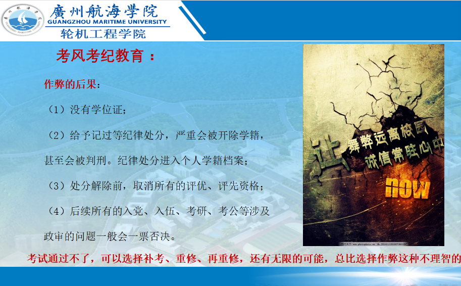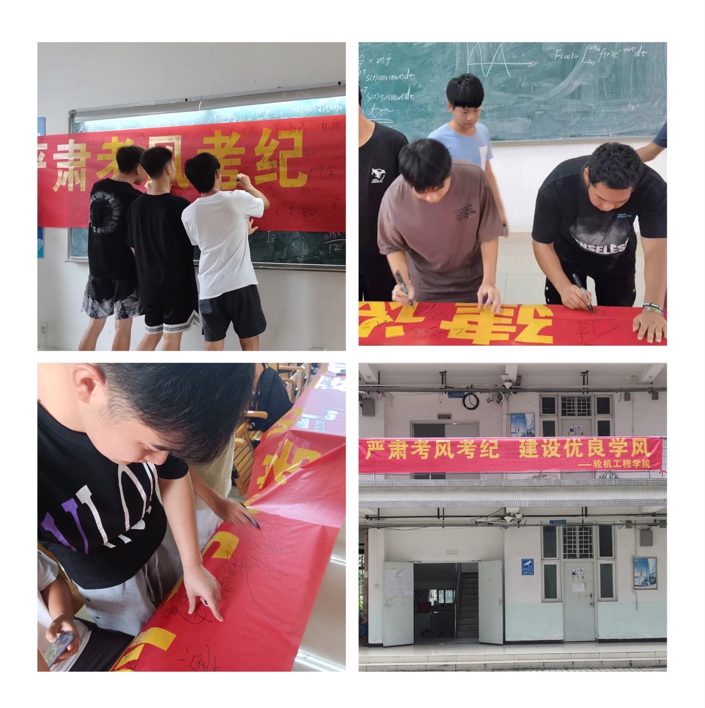 在诚信考试专题教育中,我院各中队长结合学生手册、作弊案例就哪些是作弊行为、作弊后果、作弊长远影响、作弊学生的内心分析、如何备考等方面给各年级同学进行了全面深入的讲解。因此,在各班组织诚信考试签名活动中,同学们表现的慎重又很自信,在“严肃考风考纪,建设优良学风”横幅上认真签下自己的名字,签完后一些同学还要驻足一会,以表达自己的决心和信心。签名活动结束后,这条横幅张贴在轮机工程学院南三栋学生宿舍楼内,将长久的警醒学生们抓紧学习,营造良好的考试氛围。