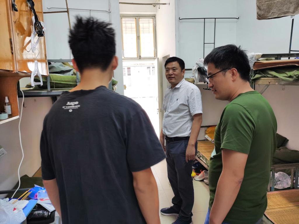 走访过程中,滕院长对所在宿舍的同学们致以节日的问候,查看了同学们的宿舍卫生、通风条件、内务整理等情况。同时叮嘱同学们假期仍要规律作息,要做好个人防护,不聚集,搞好个人内务和卫生,要注意宿舍通风。在新生年级宿舍中,滕院长耐心询问同学们大学生活适应情况,鼓励他们要积极进取,珍惜大学时光,不负韶华;在毕业年级宿舍中,滕院长与同学们亲切交流就业形势、学业计划,了解同学们的就业签约情况,鼓励同学们要积极备考大证、积极就业。