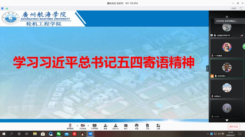 (轮机工程学院供稿)55-7日,轮机工程学院第一、第二学生党支部和分团委分别在学生第一党支部书记郭世俊老师、学生第二党支部书记钟聪仕老师和分团委书记陈茂嘉老师的带领下,通过腾讯会议平台学习了习近平总书记五四寄语精神。