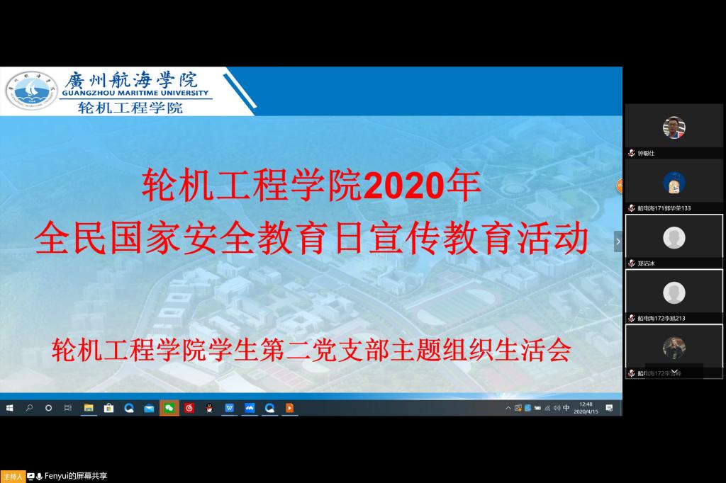 (轮机工程学院供稿)4月14日10时,为贯彻落实《教育部办公厅关于组织开展2020年全民国家安全教育日宣传教育活动的通知》和学校工作安排,切实做好大学生国家安全教育,增强大学生维护国家安全的能力,学院两个学生党支部、分团委、学生会和全院三个中队共1400余名学生积极在线开展了全民国家安全教育活动。