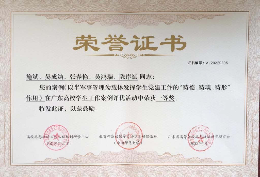 施斌、吴成结等5名老师的《以半军事管理为载体发挥学生党建工作的“铸德、铸魂、铸形”作用》工作案例在广东高校学生工作案例评选活动中荣获一等奖